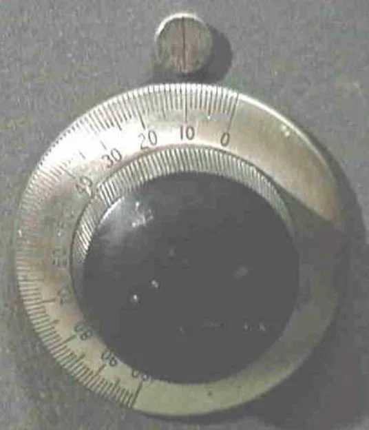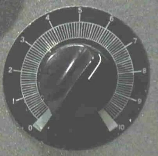 "Low" device closeup of amplitude dial for adjustment of modulation depth (strength). Above it, the empty round circular location likely held an old "magic eye" for visual confirmation of the correct radio carrier frequency. The RCA magic eye was only manufactured from 1937 through about 1941, and by 1942 had fallen out of favor.