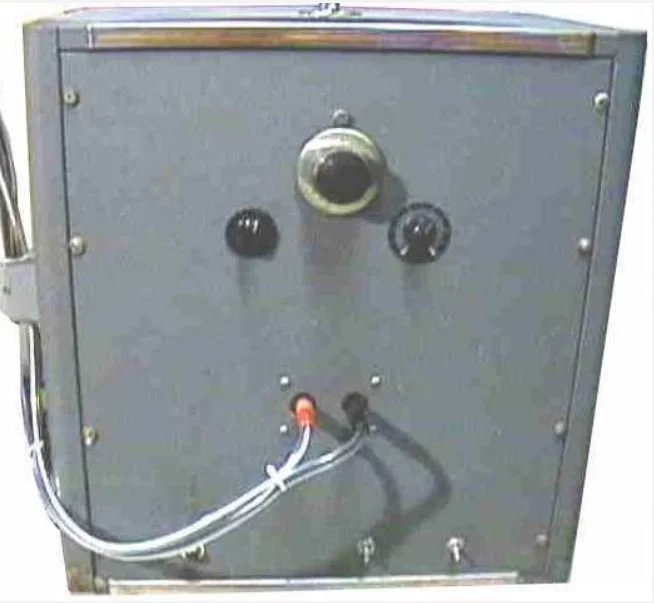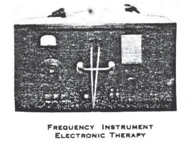 Closeup of "Scoon" device, front of cabinet. The device operated with a fixed 3.3 MHz carrier wave.