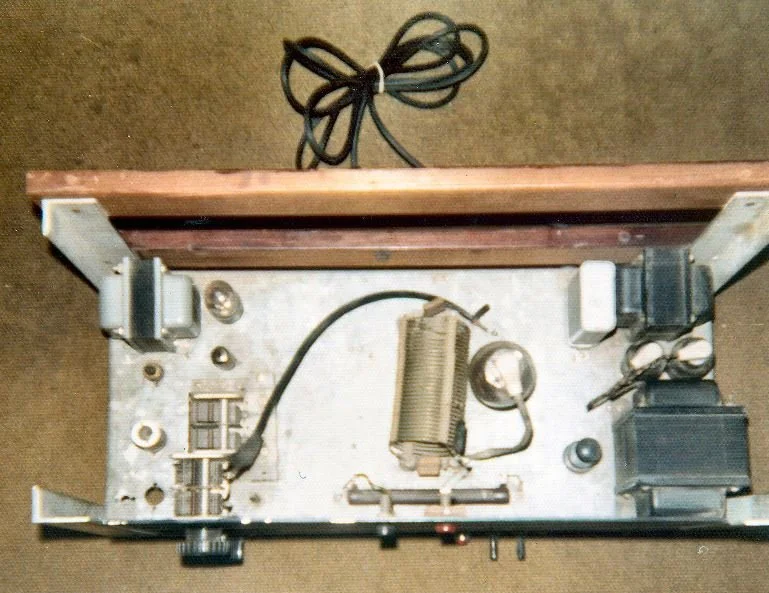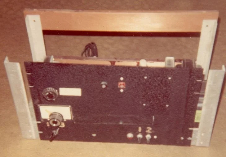 Inside view of "Low" device's circuitry, as originally found in Mr. Low's attic. Prior-drilled empty holes in the chassis indicate the cabinet housed an earlier design.