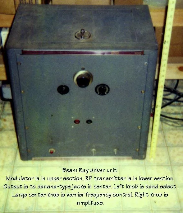 Original photo of plasma ray device as advertised at the old rife.org website. Acquired by the U.K. Rife Research Group in early 2000s, and subsequently analyzed by Aubrey Scoon, after whom the device is named. New dating of its Eico audio frequency generator places it at 1954 or later, and almost certainly built by Verne Thompson. Thompson was a radio engineer that worked with Rife for many years.