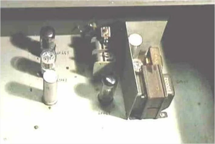 AZ-58 model 3, 1953. This image of the interior is the only photo currently available of this model. This model used a fixed carrier frequency of 4.15 MHz produced by a Hartley oscillator. The square wave audio frequency range 50 Hz - 6 kHz was produced with use of a 3-position bandswitch, and the modulation amplitude was not adjustable.